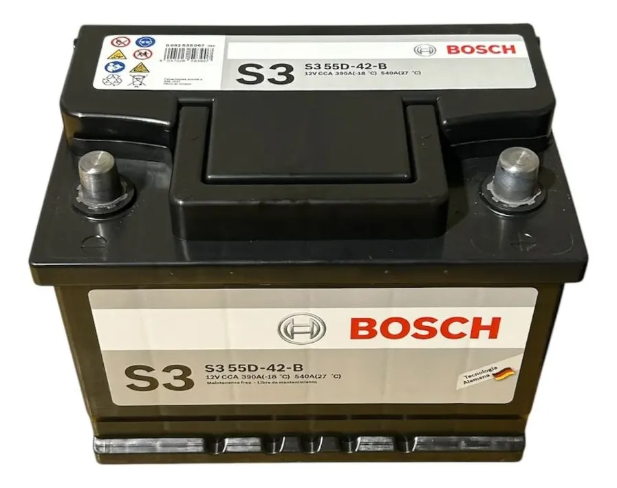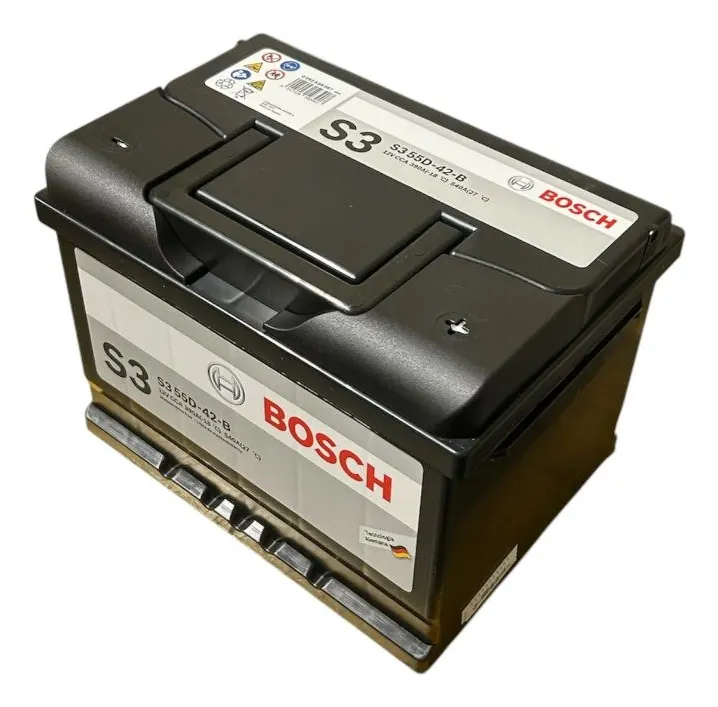 La Batería Bosch S3 55amp 390cca 12v es una opción confiable para autos y camionetas que buscan energía duradera y un rendimiento óptimo. Con una capacidad de 55.0 Ah y un corriente de arranque en frío (CCA) de 390 A, asegura un encendido eficiente en condiciones adversas. Su diseño en material ácido-plomo proporciona la robustez necesaria para enfrentar el día a día.