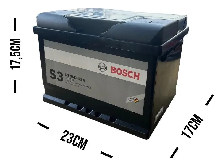 Con unas dimensiones de 17 cm de ancho, 23 cm de largo y 17.5 cm de alto, esta batería tiene un peso de 12 kg, lo que la hace fácil de instalar en la mayoría de los vehículos. Fabricada en Ecuador, se garantiza un producto de calidad local que cumple con los estándares de la marca Bosch. Su conexión positiva a la derecha garantiza un encaje adecuado en los sistemas eléctricos de su auto.